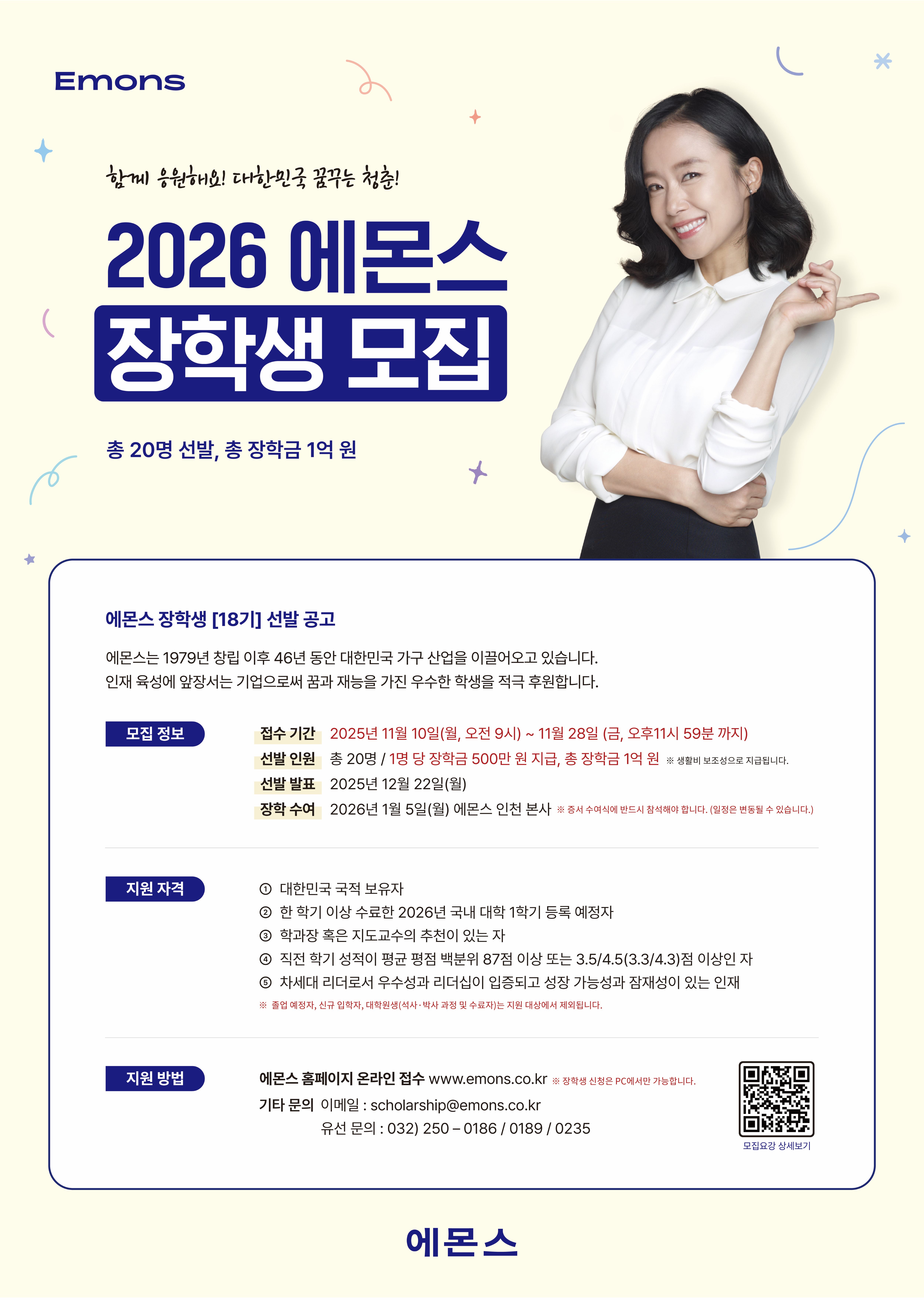 2026 에몬스 장학생 모집과 관련한 문의는 032-250-0186 / 0189 / 0235로 해주시기 바랍니다.