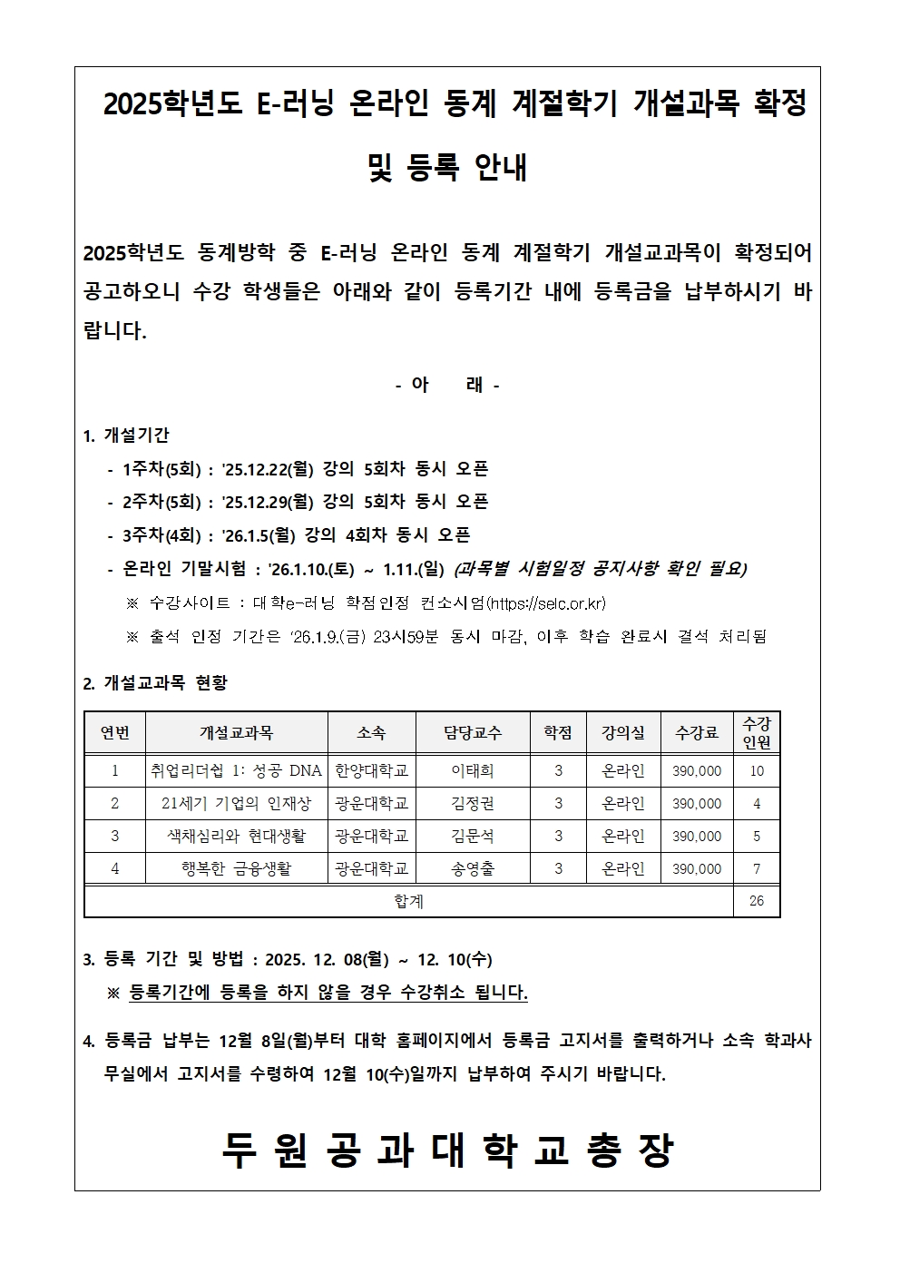 2025학년도 교내 동계 계절학기 개설과목 확정 및 등록 안내