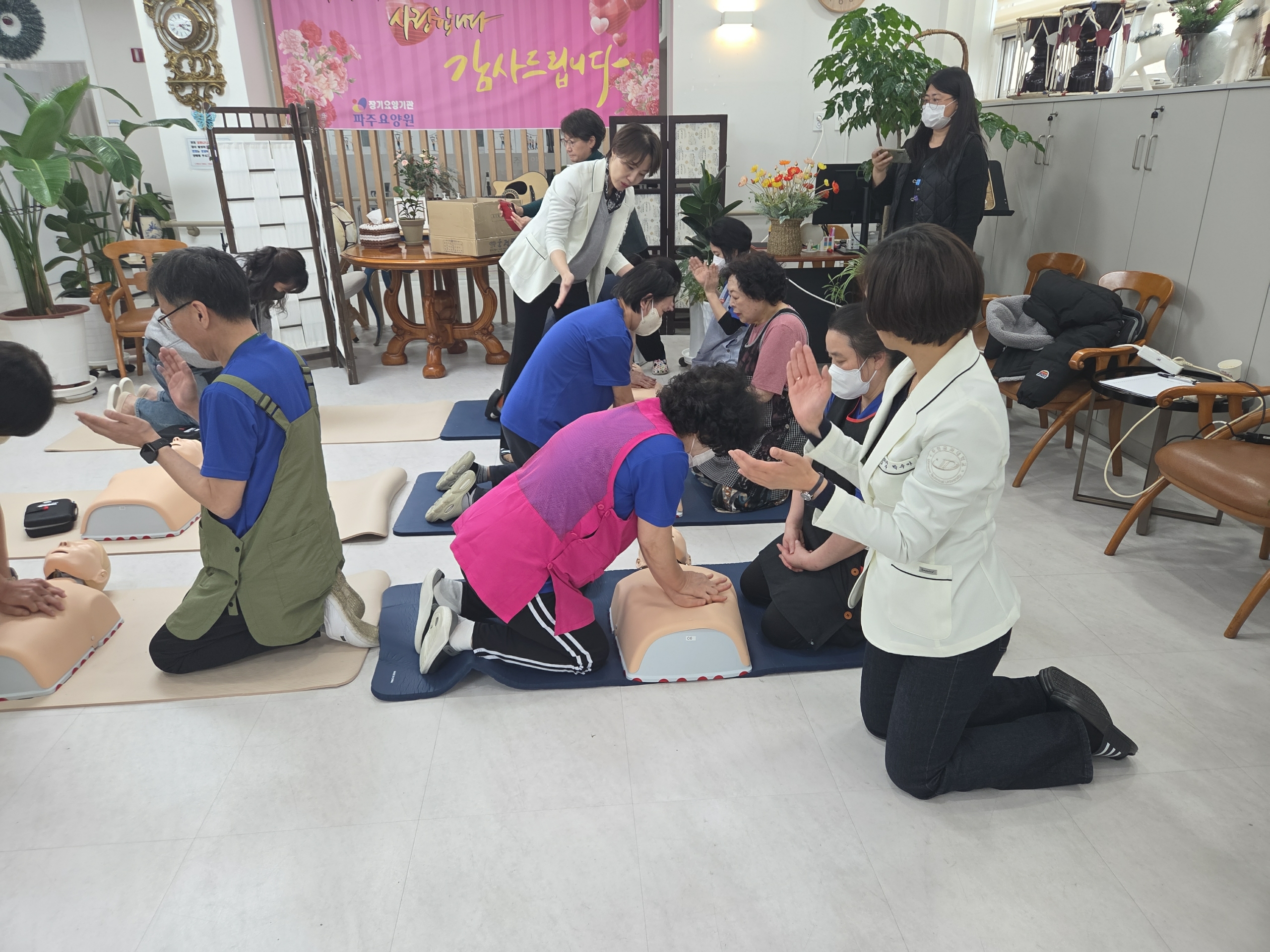 사회복지사, 요양보호사, 간호조무사 등 13명의 직원들이 요양원에서 일어날 수 있는 응급상황에 대처하기 위해 열심히 교육을 받았습니다.